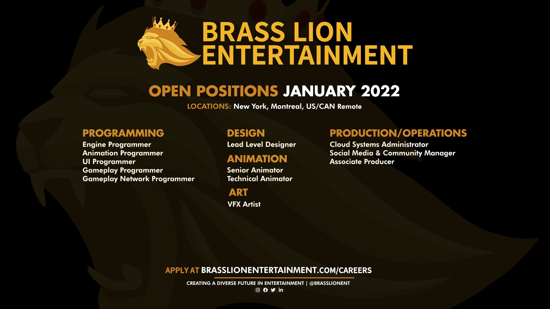 Brass Lion Entertainment On Twitter We Re Hiring Join Our Incredibly Talented And Diverse Team As We Continue To Grow Competitive Salary Pto And Work Life Balance Comprehensive Benefits Package Us